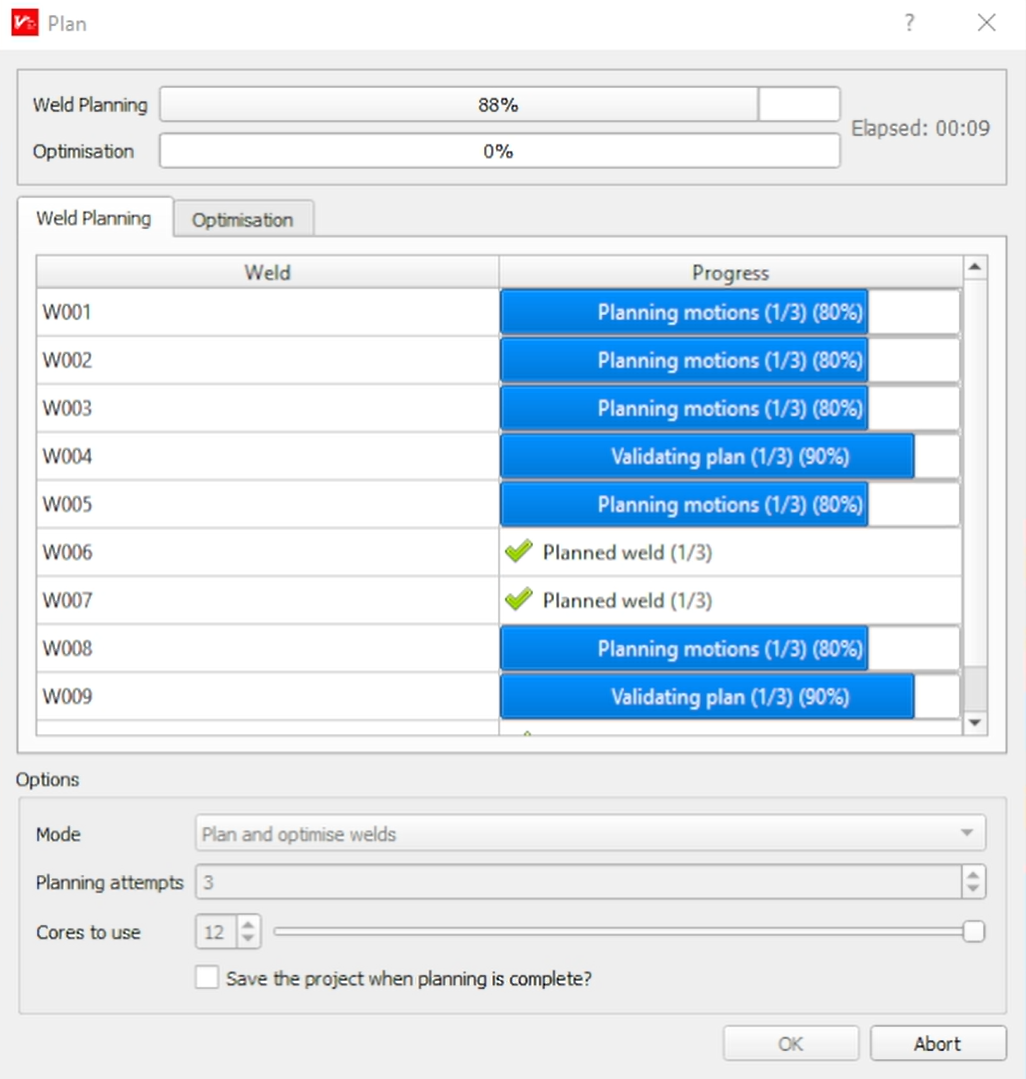 Simulate individual welds or the full program inside our software, and get an estimate of cycle time.