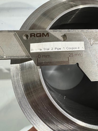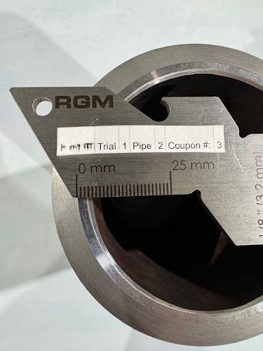 - Trial 1: 3” (DN 75) pipe, 37.5° to 25° bevel, 22 mm (.87 in) wall thickness