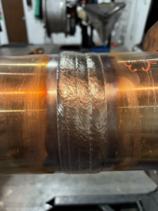 This application was welded with single wire 0.045” carbon steel ER70S-6 wire. It should be noted that faster weld times and higher deposition can be achieved by implementing Lincoln Electric’s Twin Wire MIG process, Hyperfill. This was not implemented in this case because the company’s next step is to send coupons for stainless steel welding. At this moment, Hyperfill is not available for stainless steel applications on the SWR.